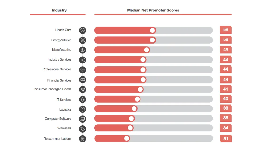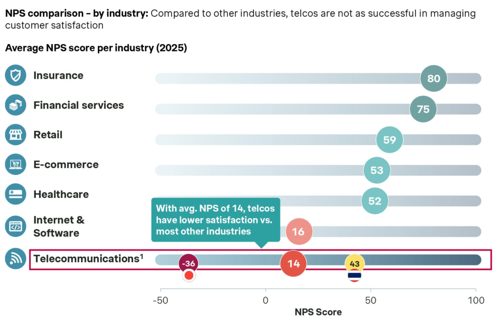 O NPS global para empresas de telecomunicações é de 14, bem abaixo de outros setores, que variam de 16 a 80. As operadoras de telecomunicações têm um potencial significativo de melhoria. Cada aumento de 10 pontos no NPS pode aumentar a receita em aproximadamente um a três pontos percentuais, o que se traduz diretamente em um impacto de maior valor.